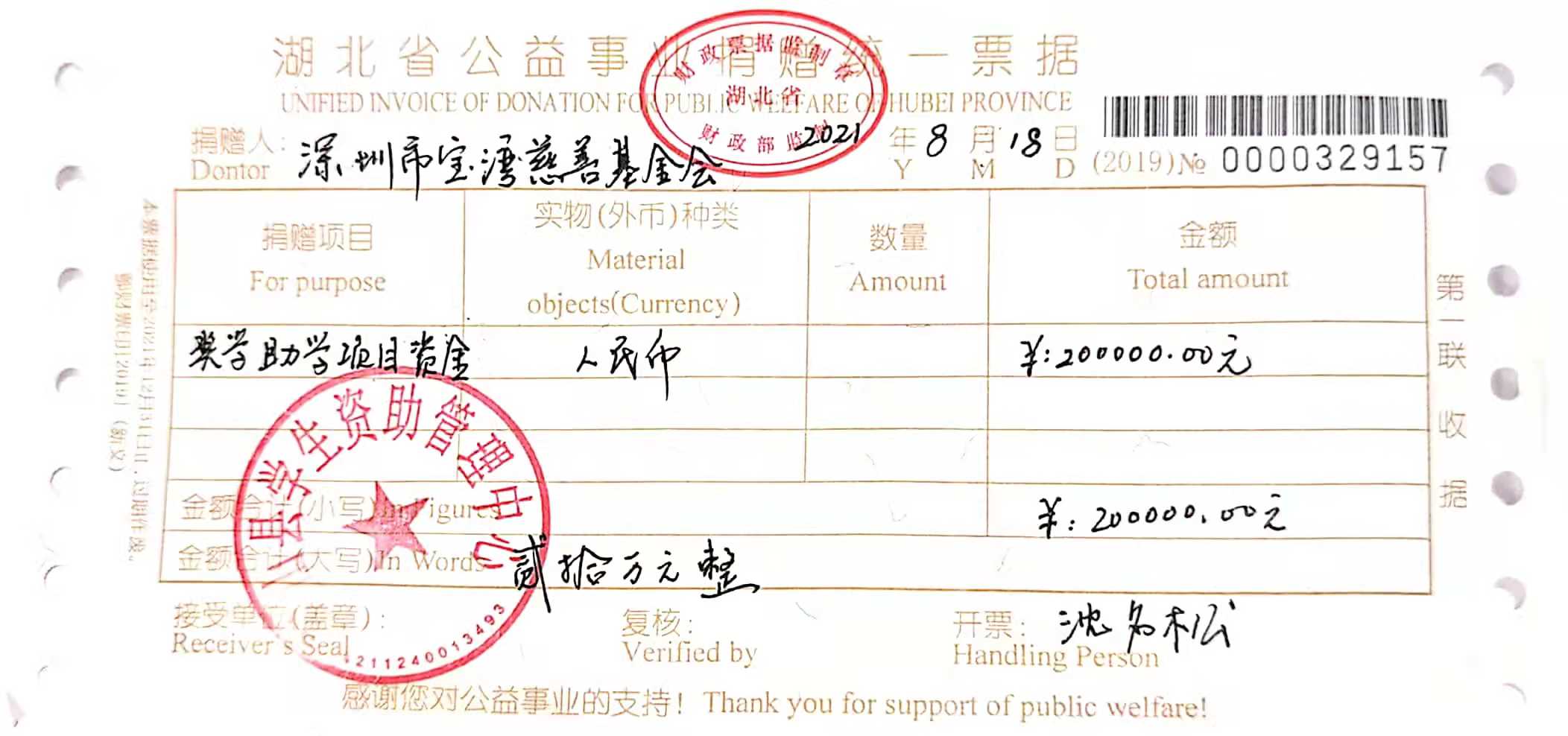 该项目自2019年建立,每年捐赠人民币200,000元,其中奖学金6万元,用于奖励20名高考、中考优秀学生;助学金14万元,用于扶助70名家境贫困的学生;2021年7月捐款到位后已由英山县学生资助管理中心分别在9月、12月通过代发银行卡打卡方式发放到位。
